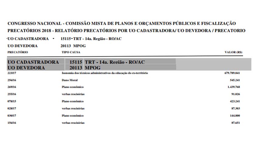 Brasília/DF - A requisição dos valores do Precatório dos Técnicos administrativos da educação de Rondônia, no valor de R$ 679 milhões de reais, já consta no relatório da Comissão Mista de Planos e Orçamentos Públicos e Fiscalização do Congresso Nacional. Trocando em miúdos, esses recursos estão garantidos para pagamento dos servidores que esperam há mais de 28 anos por esse direito.