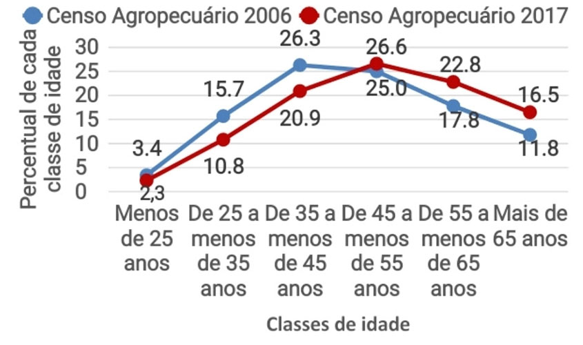 Reflexo desse envelhecimento no campo é o fato de que o número de estabelecimentos rurais que foram contemplados com recursos de aposentadorias ou pensões, em 2017, aumentou 115,7% em relação ao Censo de 2006. Em termos monetários, foram desembolsados quase 500 milhões de reais com essa finalidade, correspondendo a 8% do que foi obtido com as receitas de produção dos estabelecimentos. Essa ‘receita extra’, em muitos casos, constitui-se na principal fonte de renda dos produtores e seus familiares, haja vista que o valor de produção anual de 29% dos estabelecimentos é inferior a R$ 10.000,00.
