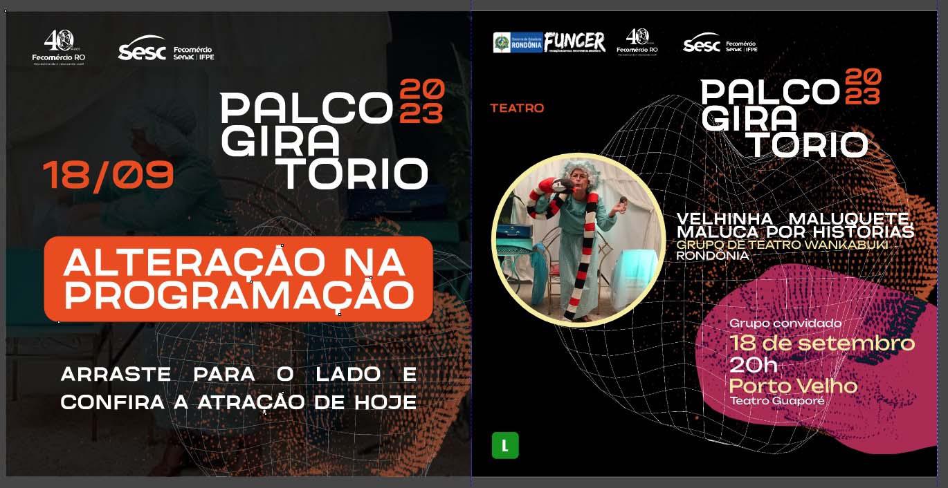 Abaixo, confira a programação do Palco Giratório 2023. No link a seguir, estão disponíveis as sinopses de todos os espetáculos que acontecerão em Porto Velho.