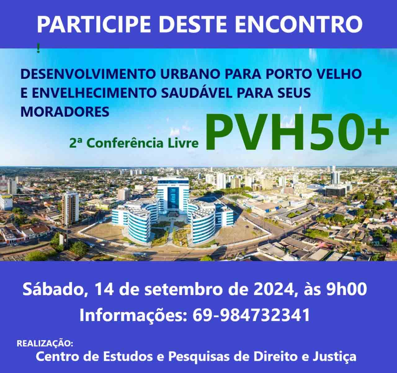 A segunda edição da Conferência Livre PVH50+ se realizará no dia 14 de setembro, tendo como tema a atenção aos idosos nos planos de governo dos candidatos à Prefeitura Municipal de Porto Velho. No evento serão discutidos a avaliados os textos protocolados pelos candidatos junto à Justiça Eleitoral e será construído um documento para ser subscrito pelos candidatos como compromisso para com uma política de desenvolvimento urbano sustentável para Porto Velho e envelhecimento saudável para seus moradores. Informações sobre inscrições estão disponíveis pelo whatsapp: 69 984732341.