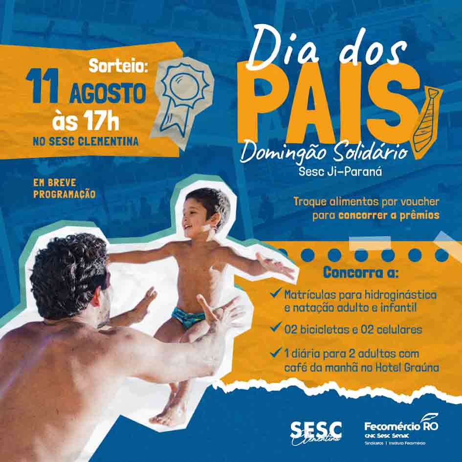Este ano, o Dia dos Pais Solidário será realizado pela 1ª vez em Ji-Paraná. O evento, além de realizar atividades de lazer na área da recreação e esporte, também tem o intuito de promover a solidariedade através da arrecadação de alimentos não perecíveis, exceto sal, que serão destinados às instituições cadastradas no Programa Mesa Brasil Sesc. A programação acontece no dia 11 de agosto no Sesc Clementina.