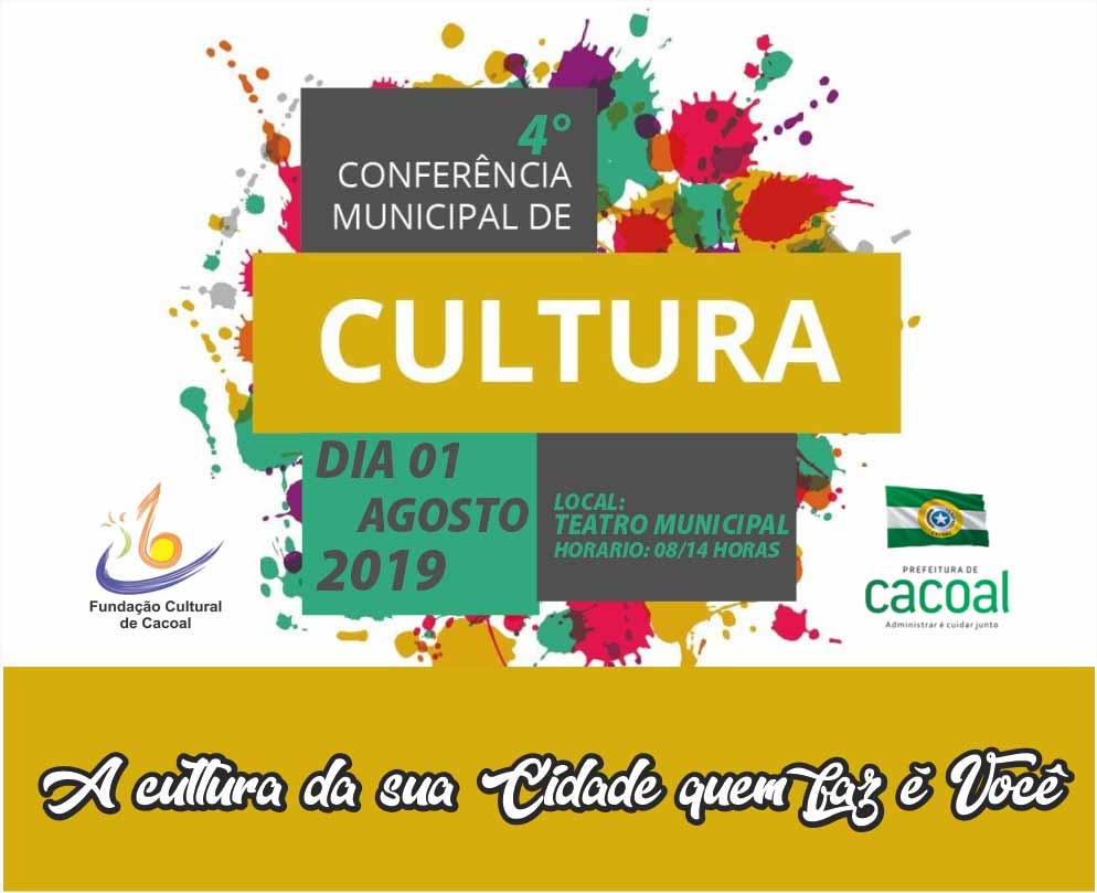 A 4º Conferência Municipal de Cultura vai acontecer nesta quinta-feira, dia 1º de agosto, no teatro Municipal. Em pauta o debate e proposição de estratégias de aprimoramento de articulação e cooperação institucional entre a sociedade civil, povos indígenas, agentes culturais, artesãos e comunidades tradicionais que dinamizem os sistemas de participação e controle social na gestão das políticas públicas de cultura para implementação e consolidação do Sistema Municipal de Cultura.