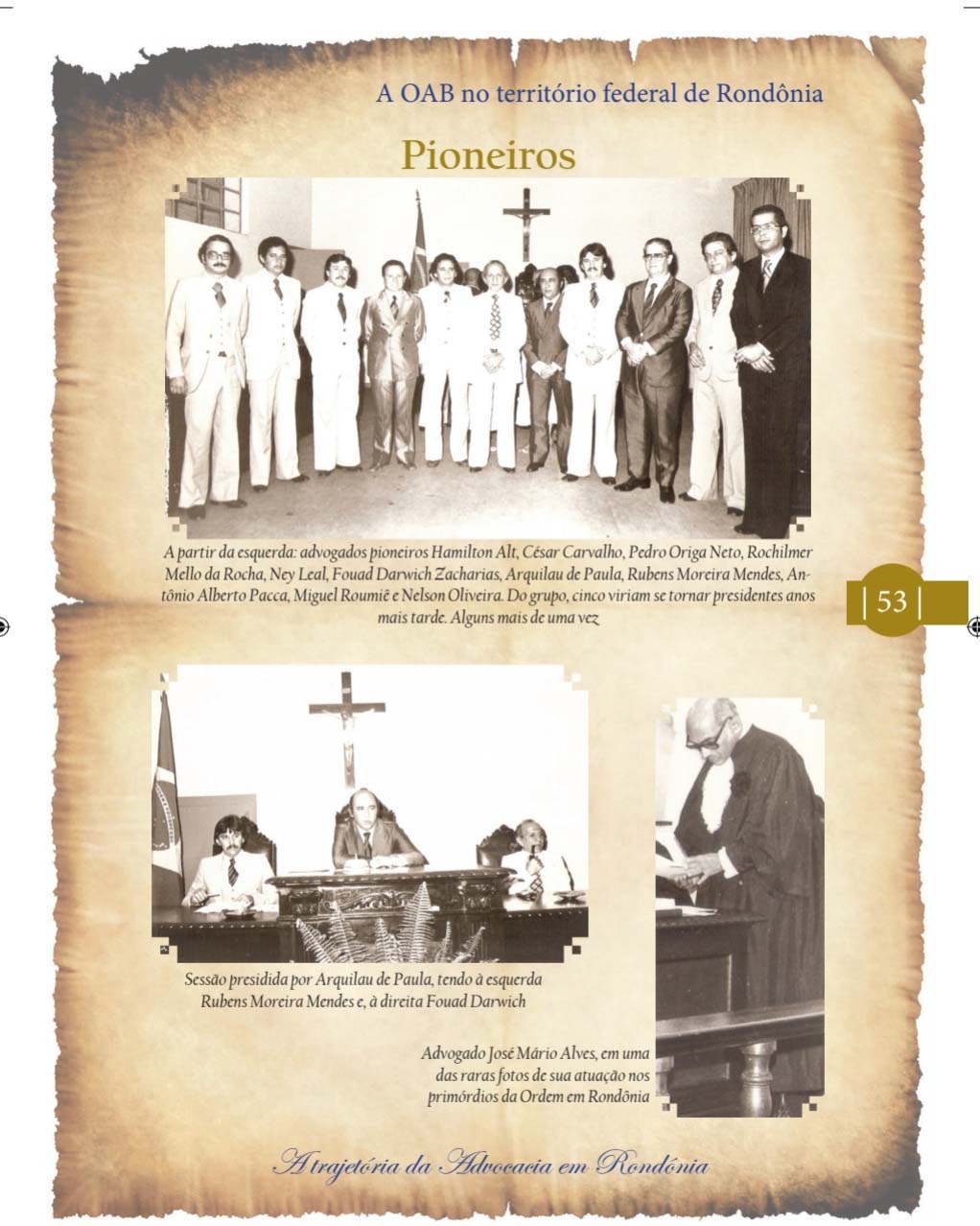 Parte desta exitosa trajetória pioneira está no livro “A Trajetória da Advocacia no Estado de Rondônia”, escritos a seis mãos pelo jornalista Carlos Araújo, pelo historiador Francisco Matias* e o advogado Hélio Vieira da Costa, que presidiu a Ordem nos triênios de 2007/2009 e 2010/2012.