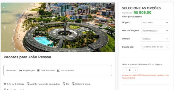 Para viagem no início do ano que vem os destaques são os pacotes para maio pelo valor de R$ 564. Para o mês de junho de 2024 a viagem para João Pessoa custará R$ 538. Quem prefere o mês de setembro há opções de pacotes de viagens pelo valor de R$ 522. Todas essas ofertas incluem 5 diárias na capital paraibana e passagens aéreas de ida e volta saindo da capital de Rondônia.
