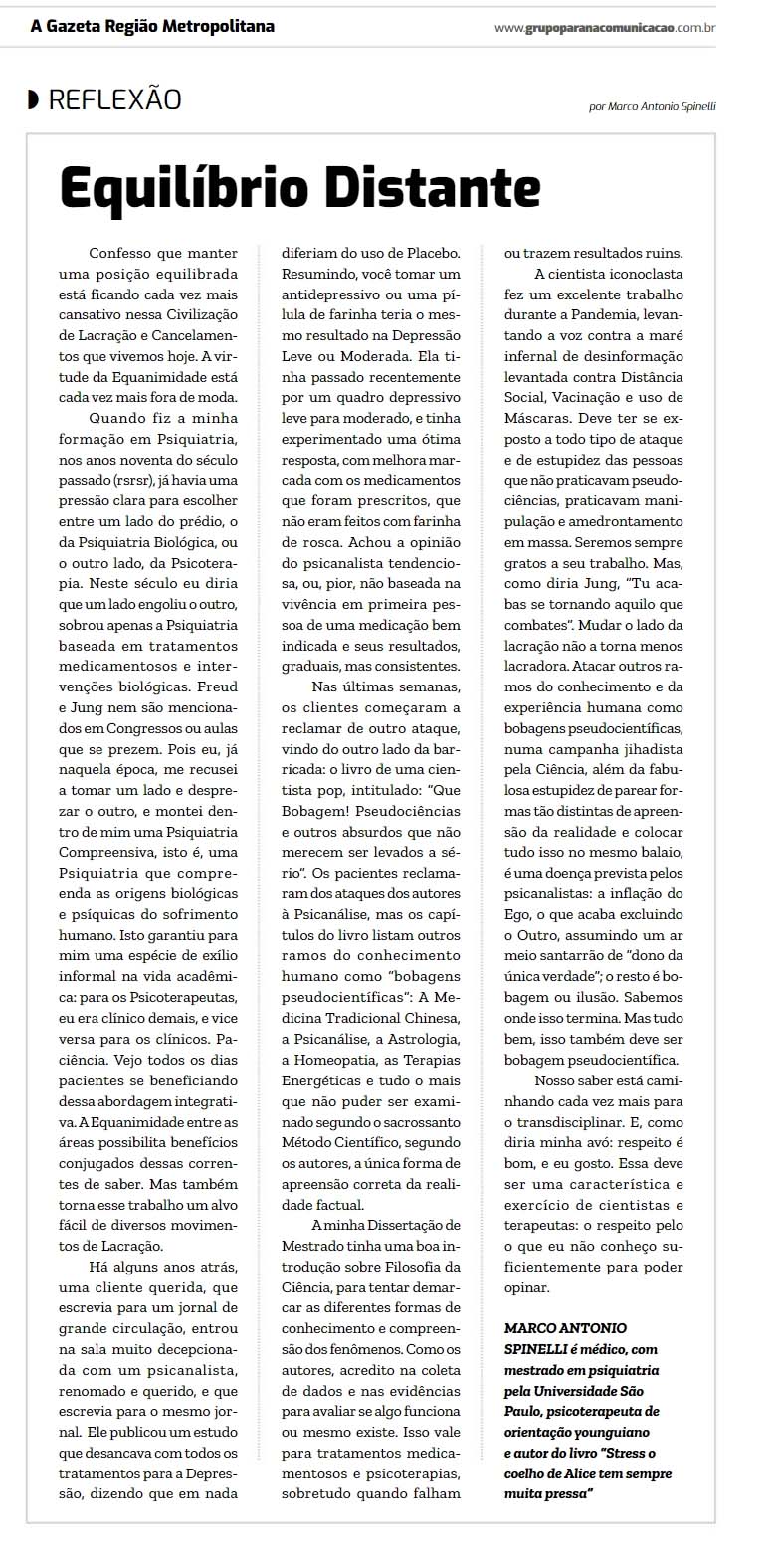 *Marco Antonio Spinelli é médico, com mestrado em psiquiatria pela Universidade São Paulo, psicoterapeuta de orientação junguiana e autor do livro “Stress o coelho de Alice tem sempre muita pressa”