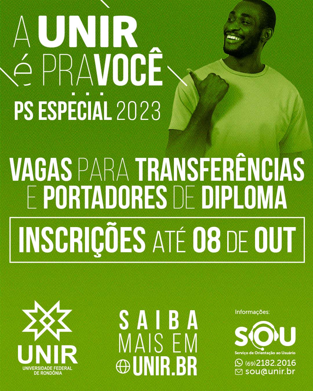SOU - Serviço de Orientação ao Usuário – Mais informações sobre o PS Especial UNIR 2023, e mesmo auxílios para as inscrições, podem ser obtidos por meio do Serviço de Orientação ao Usuário, o SOU UNIR. Para isso podem ser enviados e-mails para o endereço [email protected] ou mensagens por WhatsApp para o número (69) 2182-2016.