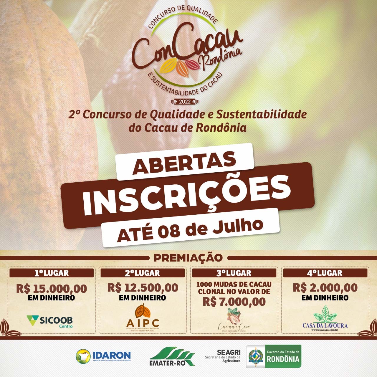 Estão abertas até 8 de julho as inscrições para a 2ª edição do Concurso de Qualidade e Sustentabilidade do Cacau de Rondônia (Concacau), idealizado pelo governo de Rondônia por meio da Secretaria de Estado de Agricultura (Seagri). Os produtores interessados vão concorrer a mais de R$ 36 mil em prêmios. A cerimônia de premiação está prevista para o dia 9 de setembro. O Sebrae em Rondônia, como de costume, estará apoiando os produtores inscritos nos envios das amostras para análises.
