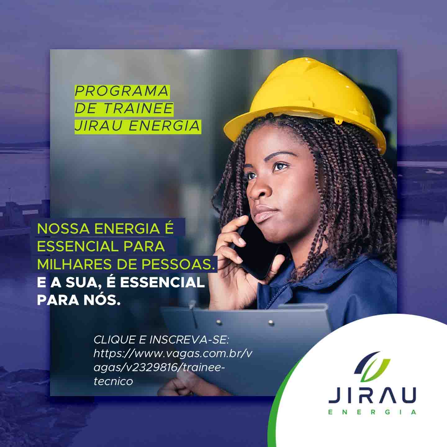 A JIRAU ENERGIA tem vagas abertas até o dia 18 de fevereiro, para o “Programa de Trainee”, o processo é direcionado para profissionais que tenham curso técnico completo relacionados a área de atuação: mecânica, elétrica, eletromecânica, eletrotécnica.