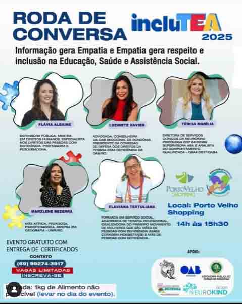 Defensoria Pública do Estado de Rondônia promove uma roda de conversa e palestras sobre os direitos da pessoa autista. O objetivo é incentivar a inclusão, apoiar autistas e suas famílias e aprofundar o entendimento sobre essa condição. As palestras serão realizadas no formato híbrido, com transmissão ao vivo.