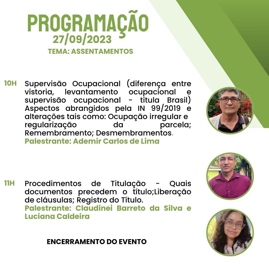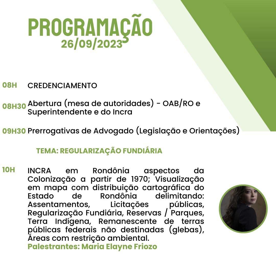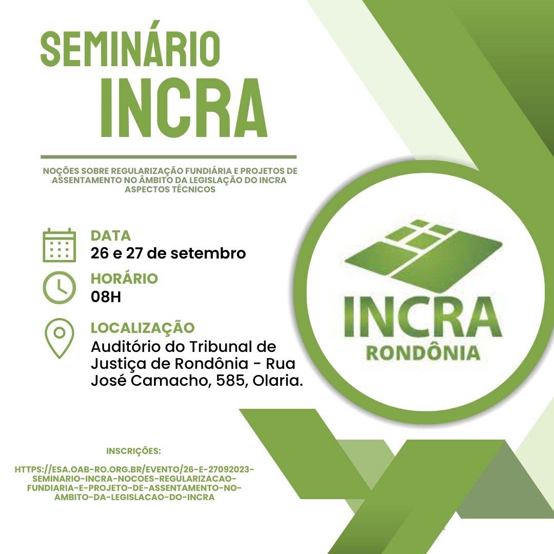 Inscrições no link: https://esa.oab-ro.org.br/evento/26-e-27092023-seminario-incra-nocoes-regularizacao-fundiaria-e-projeto-de-assentamento-no-ambito-da-legislacao-do-incra