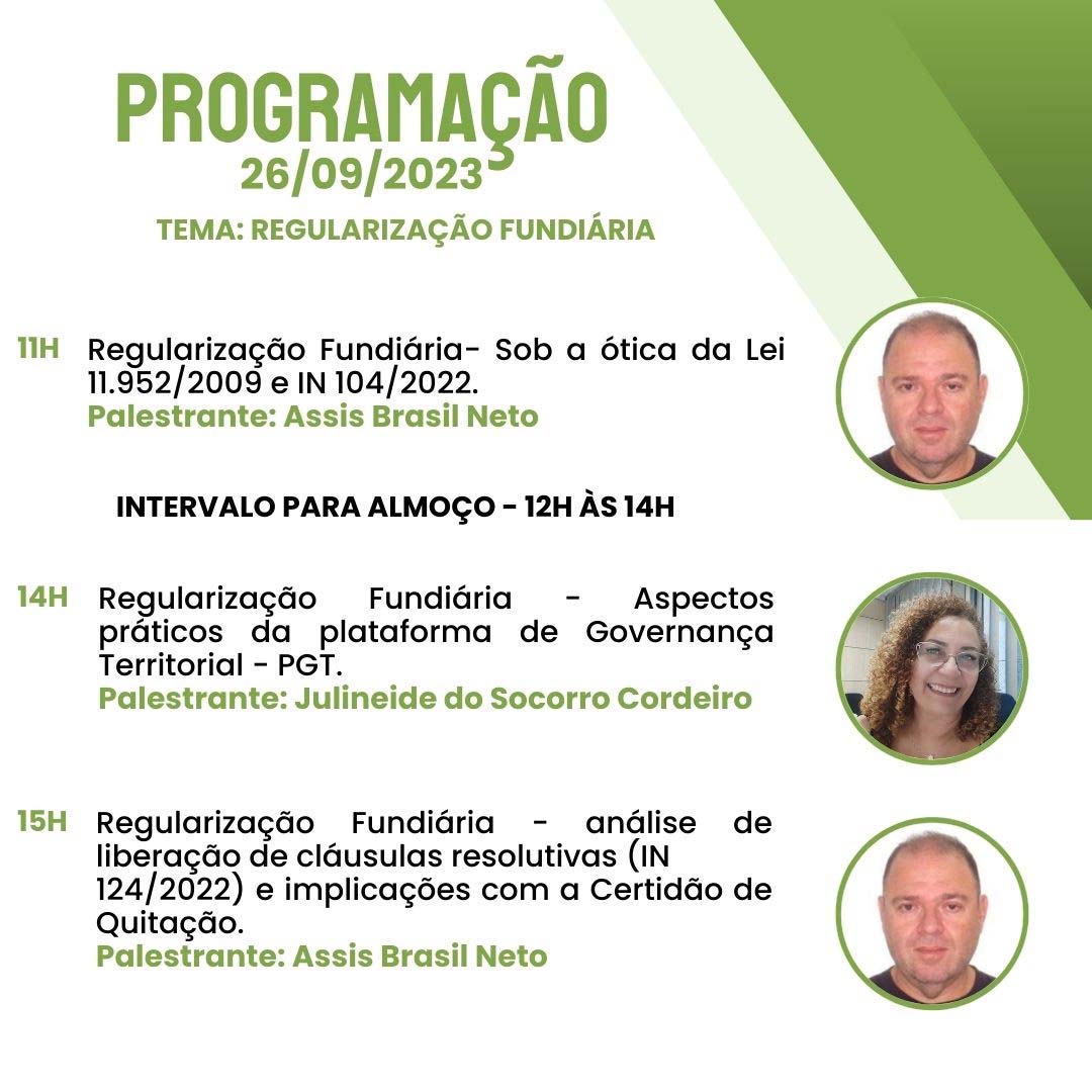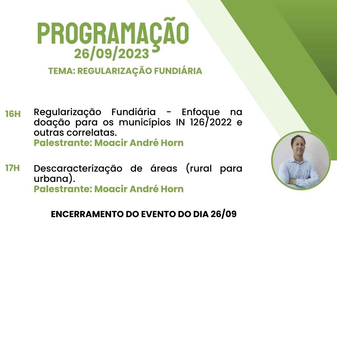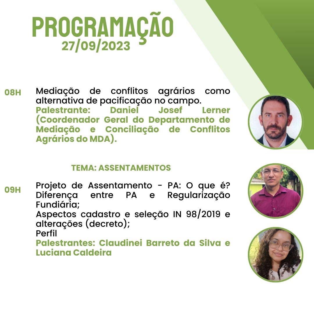 Inscrições no link: https://esa.oab-ro.org.br/evento/26-e-27092023-seminario-incra-nocoes-regularizacao-fundiaria-e-projeto-de-assentamento-no-ambito-da-legislacao-do-incra