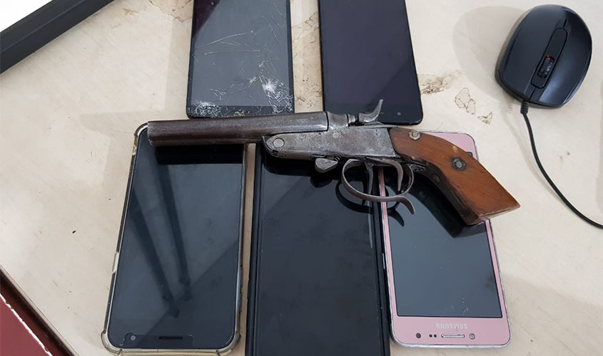 O caso foi registrado na Central de Flagrantes, onde foram entregues cinco aparelhos celulares e uma arma, sendo que as vítimas reconheceram o suspeito como autor do roubo