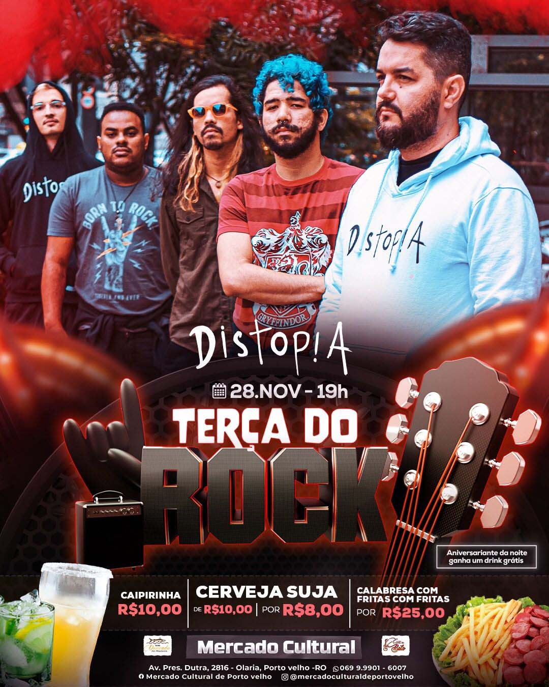 A partir das 19h, vai ter show da banda Distopia, mandando os clássicos do rock e músicas autorais.