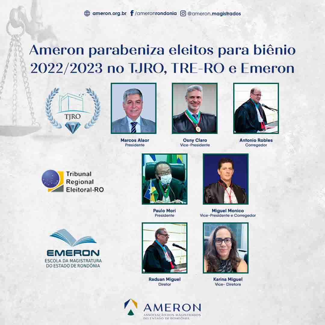 Foram eleitos para o TJRO: presidente, desembargador Marcos Alaor Diniz Grangeia; vice-presidente, Osny Claro de Oliveira Junior; e corregedor-geral da Justiça, José Antônio Robles. No TRE-RO, foram eleitos como presidente Paulo Kiyochi Mori e vice Miguel Monico Neto, tendo como 1º Suplente o Des. Valdeci Castellar Citon e 2º Suplente o Des. José Jorge Ribeiro da Luz. Já na Emeron, atuará como diretor o desembargador Raduan Miguel Filho e para vice-diretora a Juíza de Karina Miguel Sobral.