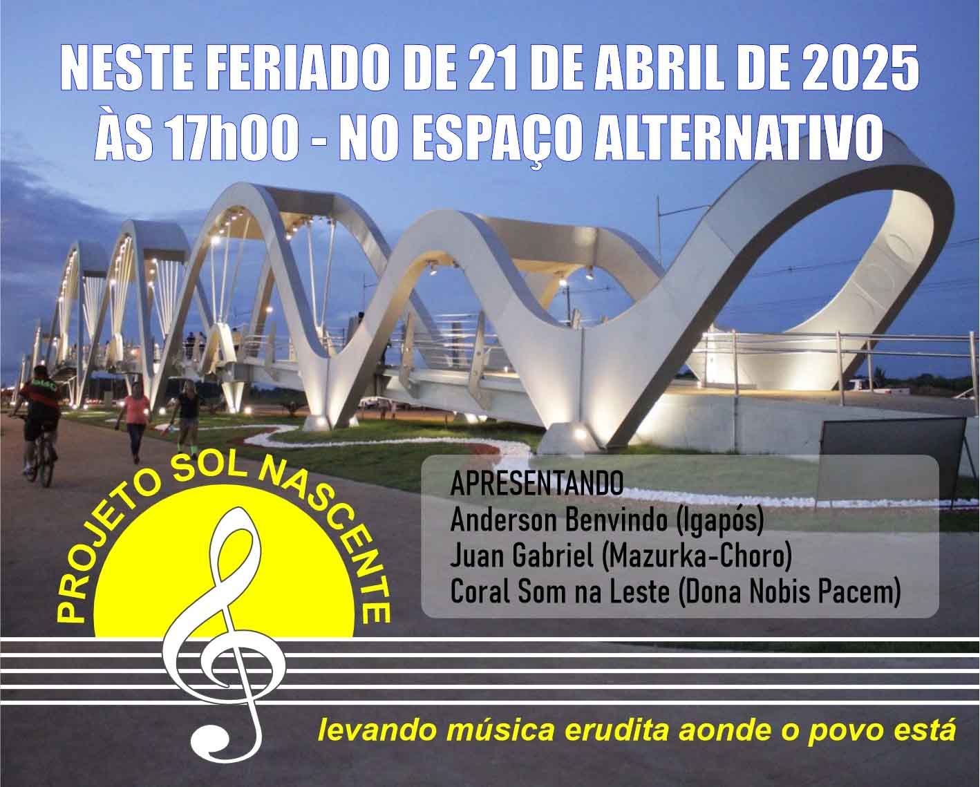 Neste No dia 21 de abril, às 17h30, o Espaço Alternativo de Porto Velho será palco da primeira apresentação pública do Projeto Sol Nascente. A iniciativa propõe novas formas de relação entre o público e a música de concerto, apostando na ocupação de espaços públicos com performances gratuitas e acessíveis à população.