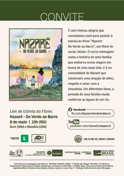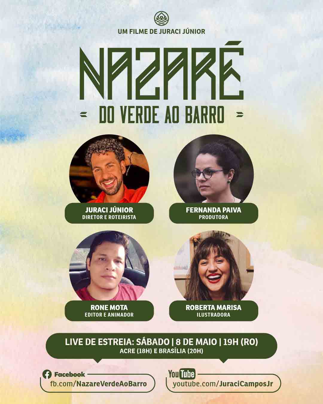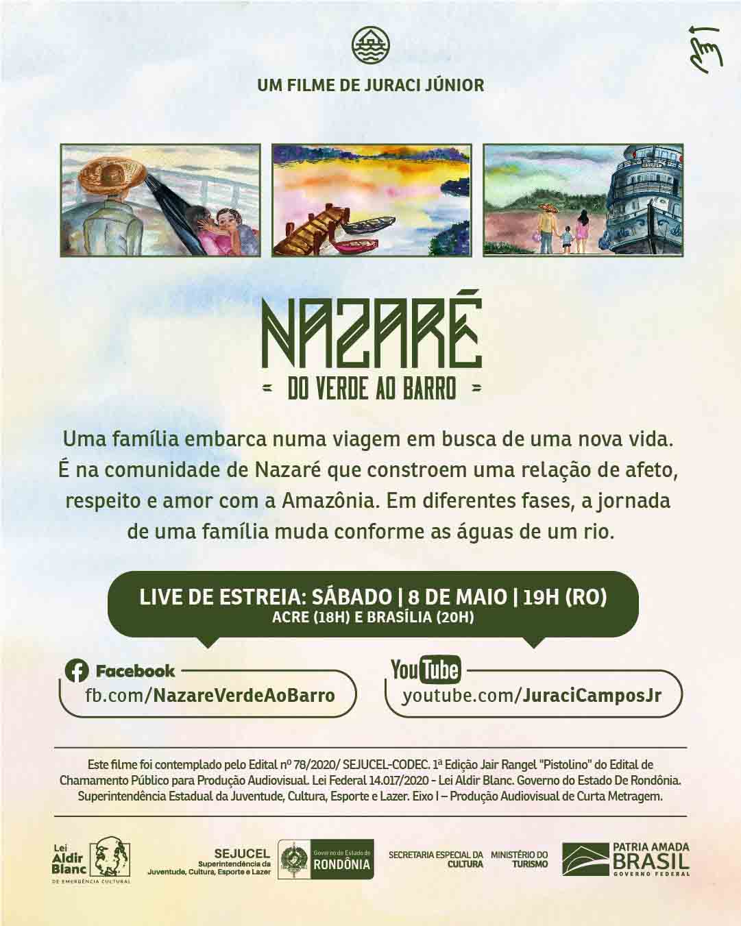 Animação inspirada em Nazaré, distrito do baixo Madeira em Porto Velho, estreia neste final de semana. Nazaré: do verde ao barro é um filme de Juraci Júnior, que faz um mergulho na história de formação da comunidade e a relação de seus moradores com a natureza e, especialmente, com o movimento do rio. A obra conta com trilha original de Tullio Nunes, músico e produtor musical nascido em Porto Velho, mas criado no distrito; aquarelas da poeta e ilustradora Roberta Marisa; e montagem, animação e finalização de Rone Mota. A estreia acontece no sábado (08), através do YouTube, às 19h.