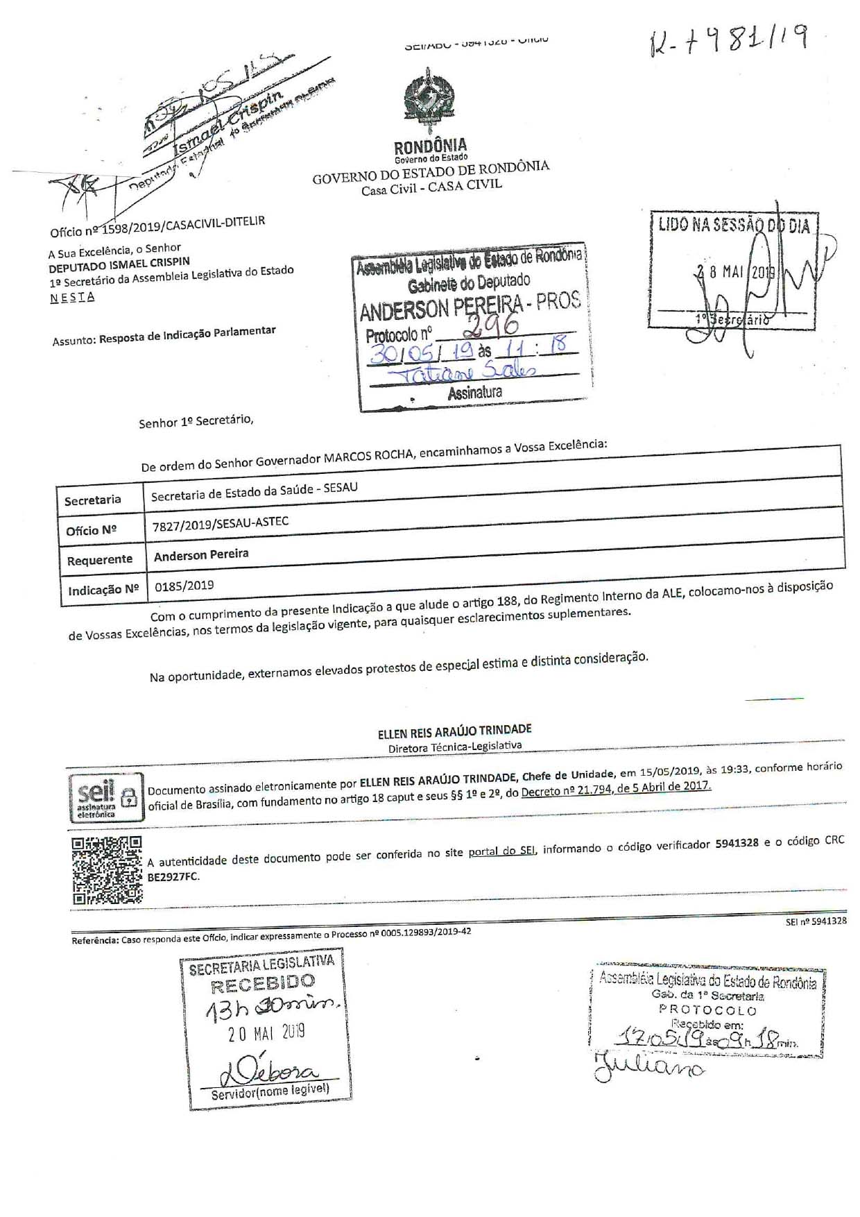 O deputado estadual Anderson Pereira (Pros) solicitou da Secretaria de Estado de Saúde – Sesau, através do ofício 185/2019, informações quanto à necessidade de realização de ação emergencial de limpeza e serviço de combate a pragas, bem como providências sobre instalações de lixeiras adequadas no Hospital e Pronto Socorro João Paulo II, em Porto Velho, após veiculação de matéria jornalística que mostrou a presença de roedores no local onde é armazenado o lixo.