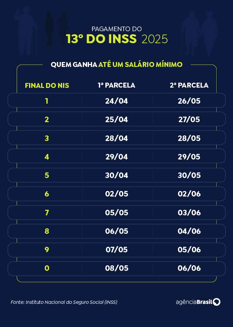 O decreto com a antecipação do décimo terceiro do INSS foi assinado no início do mês passado pelo presidente Luiz Inácio Lula da Silva. Este será o sexto ano seguido em que os segurados do INSS receberão do décimo terceiro antes das datas tradicionais, em agosto e em dezembro.Em 2020 e 2021, o pagamento ocorreu mais cedo por causa da pandemia de covid-19. Em 2022 e 2023, as parcelas foram pagas em maio e junho. Em 2024, em abril e maio.