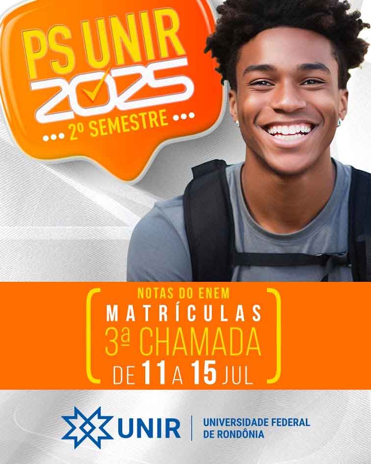 E há também o Edital Unificado de convocação para matrículas em 3ª chamada nos cursos com entrada no segundo semestre letivo de 2025 - PS UNIR 2025. A lista de convocação do edital unificado inclui os candidatos aprovados com a nota do Enem (após manifestação de interesse) nos Editais de Ações Afirmativas e de Cotas e Ampla Concorrência (mais detalhes aqui).