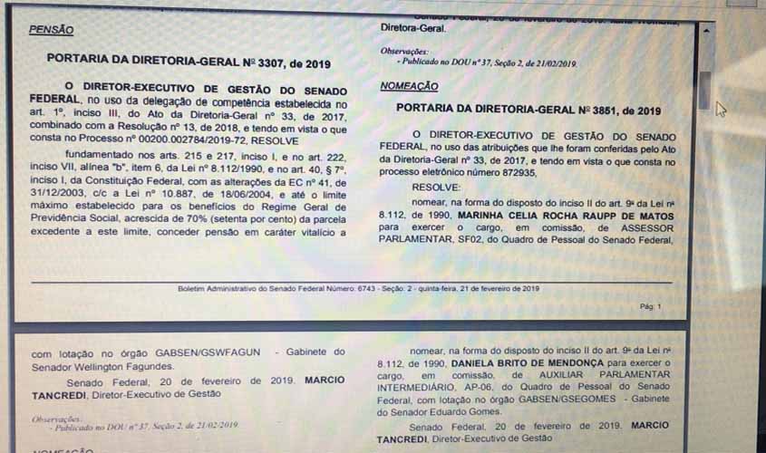 Segundo a portaria que a nomeou, Marinha Raupp ficará lotada no gabinete do senador Wellington Fagundes (PR), do Mato Grosso.
