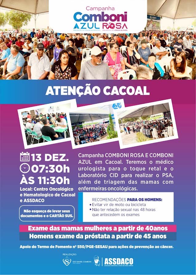No próximo sábado, dia 13 de dezembro, a Associação Assistencial à Saúde São Daniel Comboni (ASSDACO) realiza a última edição do ano das campanhas Comboni Rosa e Comboni Azul, desta vez em Cacoal.