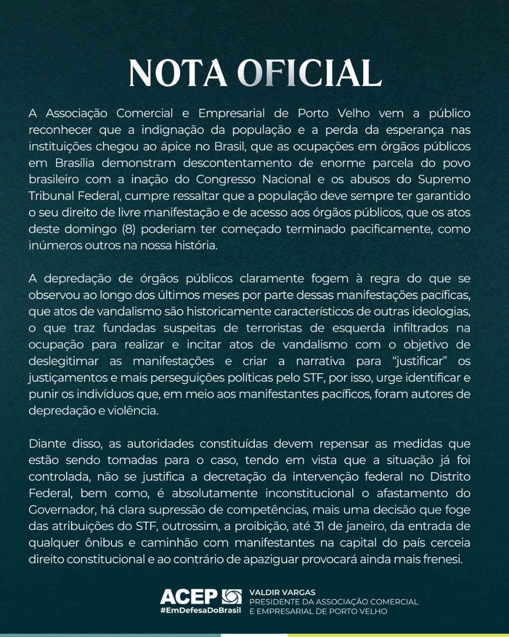Associação Comercial de Porto Velho apoia terroristas, ataca STF e diz que quebra-quebra em Brasília foi feito pela esquerda