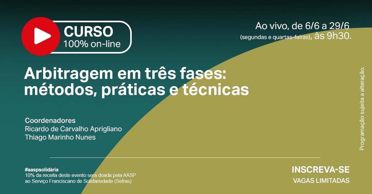 A Associação dos Advogados de São Paulo – AASP promove no próximo de junho o curso “Arbitragem em três fases: métodos, práticas e técnicas” que será ministrado entre os dias 06 e 29/6, sempre as segundas e quartas-feiras, das 9h30 às 12h30 (horário de Brasília). O evento será 100% online, com transmissão pela plataforma Zoom ou Google Meet. Será aplicada a metodologia do ensino participativo com aulas guiadas, dialogadas, método de caso, roleplay, brainstorming e Problem-Based Learning – PBL. As vagas são limitadas.