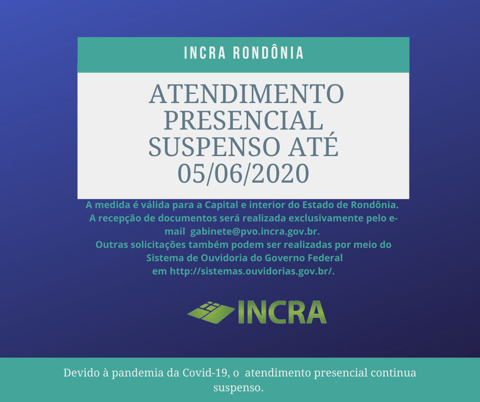 A superintendência do Incra em Rondônia informa a continuidade da suspensão do atendimento presencial em suas unidades de Porto Velho-RO e interior até o dia 05 de junho de 2020.