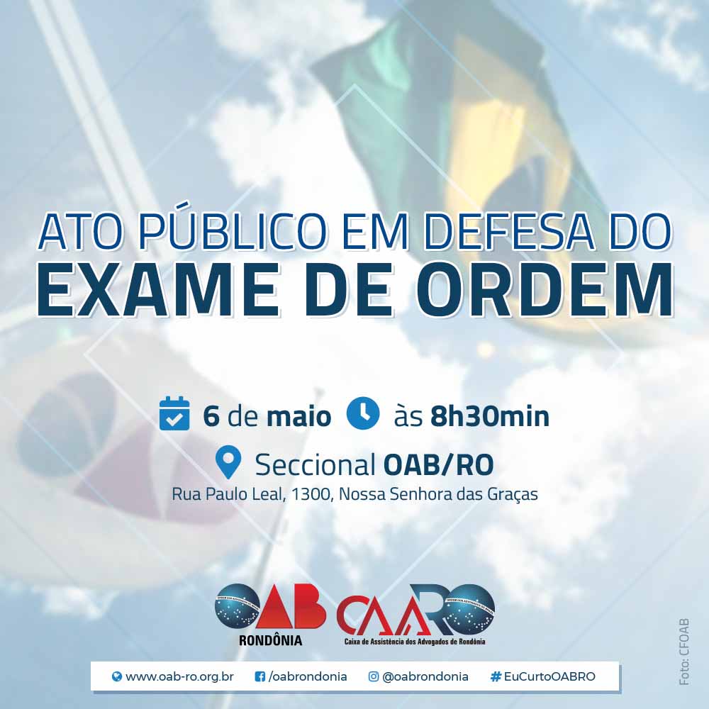 Em contestação às manifestações para alterações legislativas que visam extinguir o Exame de Ordem como exigência para inscrição na OAB e, consequentemente, para o exercício da advocacia, a Ordem dos Advogados do Brasil – Seccional Rondônia (OAB/RO) realizará, na próxima segunda-feira (6), às 8h30, na sede da instituição, em Porto Velho, um ato em defesa da manutenção do Exame de Ordem.