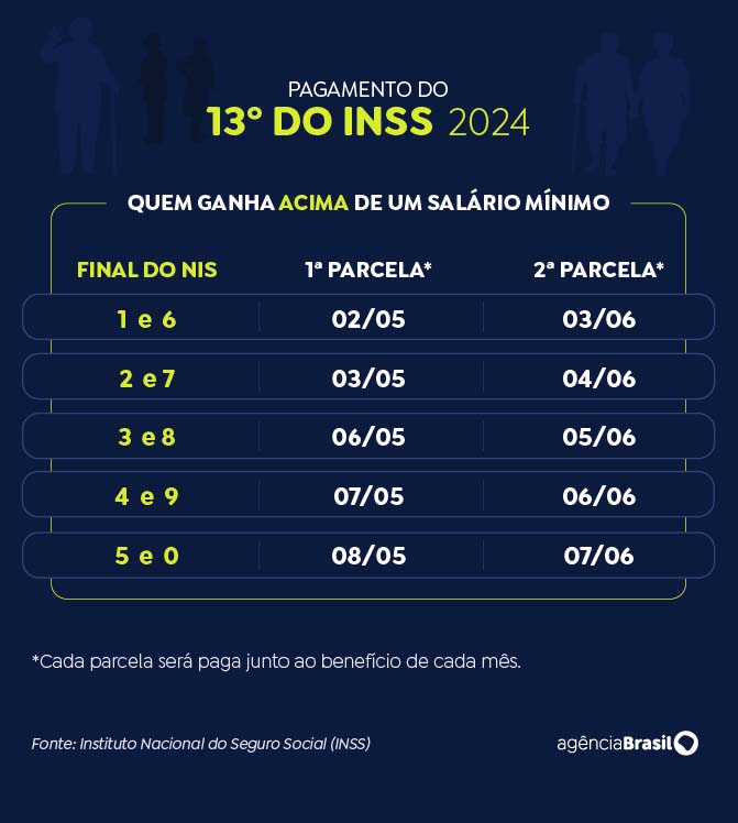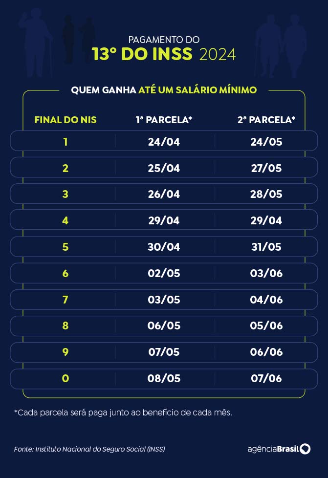 O dinheiro será depositado junto com o benefício referente ao mês de abril, pago entre 24 de abril e 8 de maio. Os segurados com benefício com dígito final 1 e que ganham até um salário mínimo vigente (R$1.412) serão os primeiros a receber e, assim, por dia diante. A segunda parcela do 13º salário do INSS de 2024 será paga com os benefícios regulares de maio, creditado entre o fim de maio e o início de junho.