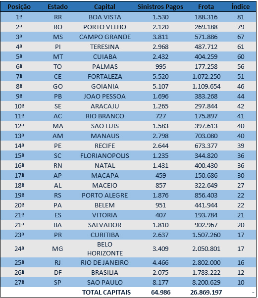 De acordo com o levantamento, Boa Vista teve 81 indenizações pagas pelo Seguro DPVAT a cada dez mil veículos. Porto Velho, a segunda colocada, registrou 79 pagamentos, enquanto Campo Grande atingiu 67. Na sequência, Teresina (61), Cuiabá (60), Palmas (56), Fortaleza (51), Goiânia (46), João Pessoa (44) e Aracaju (42) completam, respectivamente, as dez primeiras posições.