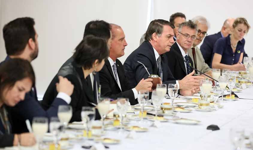 O presidente Jair Bolsonaro e o ministro-chefe da Casa Civil, Onyx Lorenzoni, em café da manhã com jornalistas de agências internacionais, no Palácio do Planalto - Marcos Corrêa/PR