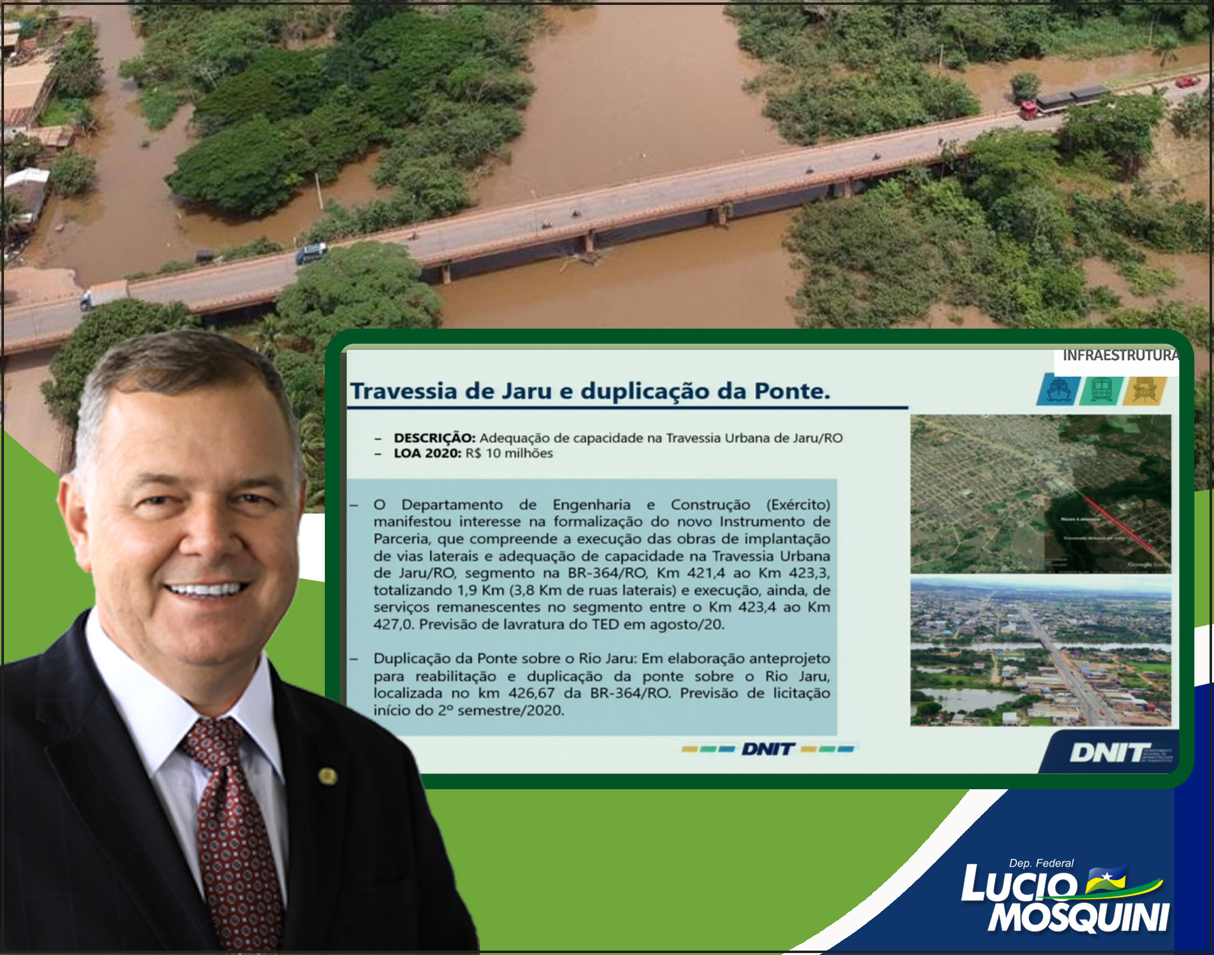 Ao falar sobre a duplicação da ponte sobre o Rio Jaru, o ministro Tarcísio garantiu que as obras devem iniciar no próximo ano e que o DNIT já dispõe de 10 milhões em caixa destinados por meio de emenda parlamentar do deputado Lucio Mosquini.
