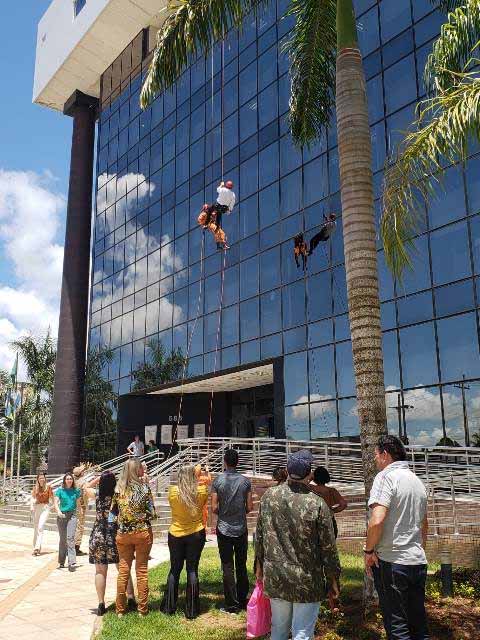 Walter Waltenberg desce de rapel do topo do edifício-sede para dar exemplo aos servidores.