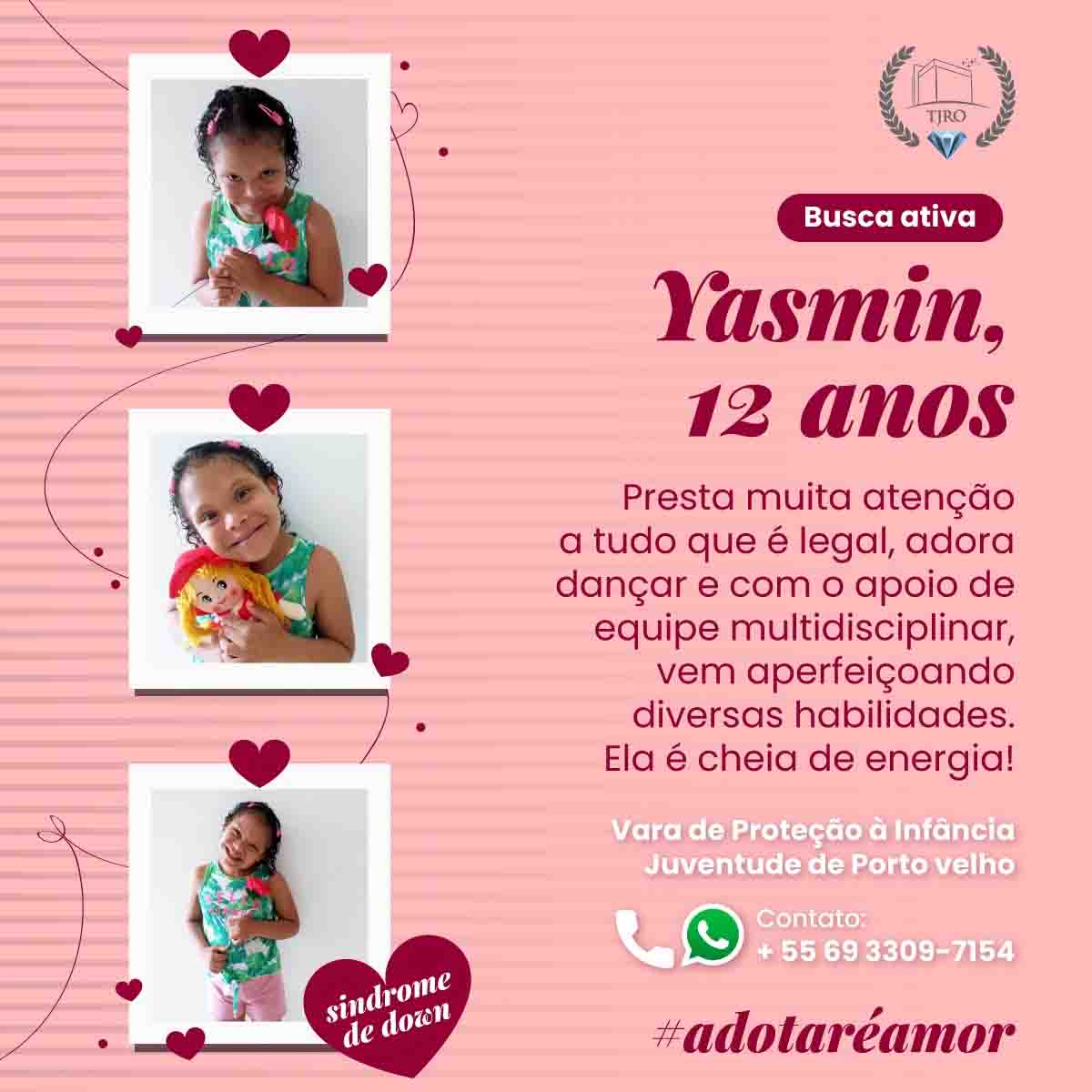 Ela é carinhosa, comunicativa, gosta de dançar e aprender coisas novas. Assim, pela descrição da personalidade da Yasmin, uma das milhares crianças brasileiras à espera da adoção, parece não ser difícil imaginar que logo apareçam pessoas interessadas em adotá-la. Mas, por uma simples foto, é possível concluir porque essa espera tem se arrastado por tanto tempo. Yasmin tem 12 anos e um diagnóstico de Síndrome de Down, um perfil que foge à preferência dos interessados na adoção. Com potencial para desenvolver habilidades, Yasmin busca primeiro encontrar uma família, o que tem sido impulsionado com a estratégia da busca ativa.