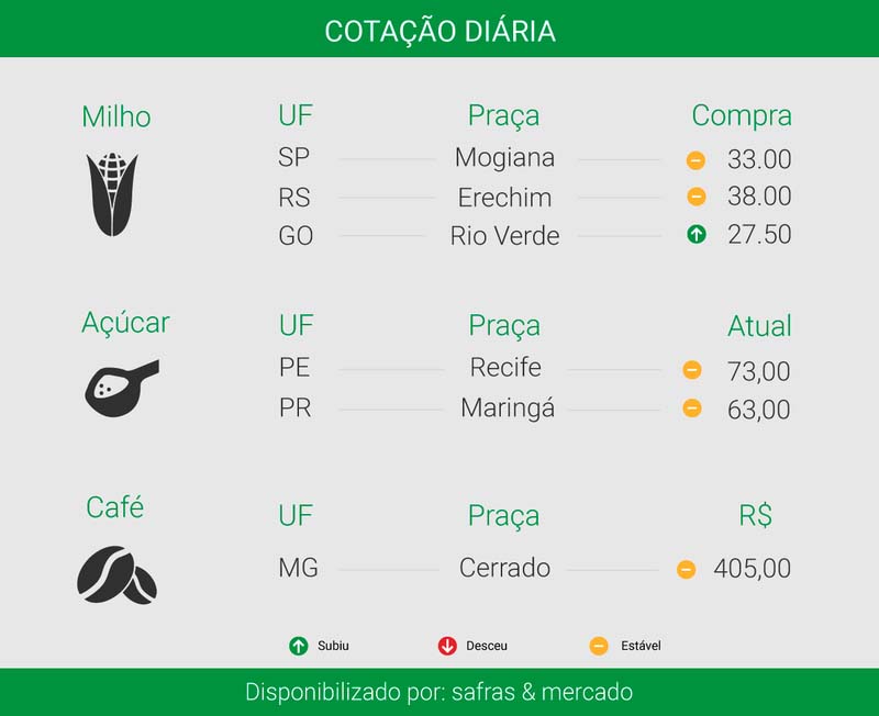 No mercado financeiro, o preço da saca de 60 quilos do milho registrou redução de 0,22% e é negociada a R$ 36,14. Em Campinas, em São Paulo, o produto teve alta de 0,14% no valor e a saca é comercializada a R$ 35,50. Em Cascavel, no Paraná, o preço é R$ 33. Em Rondonópolis, no Mato Grosso, o produto é vendido a R$ 28. Em Barreiras, na Bahia, o preço a vista é R$ 31. Os valores são do Canal Rural e Cepea.