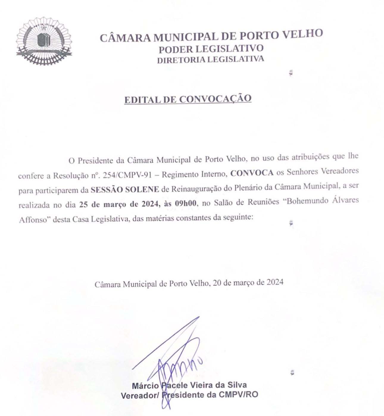 A convocação para a Sessão Solene foi feita com base na Resolução n°. 254/CMPV-91 - Regimento Interno, que confere ao Presidente da Câmara as atribuições necessárias para este tipo de cerimônia.