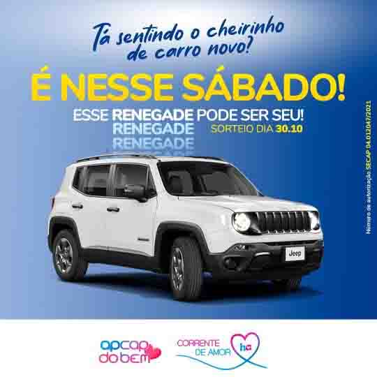 A campanha Corrente de Amor entra na reta final nesta semana com o sorteio especial de um JEEP RENEGADE 0KM, no sábado, dia 30. A ação fomenta doações em prol do Hospital de Amor de Barretos, que realizou mais de 910 mil atendimentos gratuitos em 2020, operando com déficit mensal de mais de R﹩ 36 milhões. O projeto fomenta doações com a oportunidade de concorrer a prêmios durante o ano todo. "A campanha em andamento termina no sábado com o sorteio do carro, e na sequência já iniciaremos mais uma campanha. O Hospital de Amor tem uma rede enorme de atendimentos que não pode parar e a Corrente de Amor é uma das formas de arrecadar doações para a manutenção da instituição", explica Larissa Mello, coordenadora de Campanhas do Hospital de Amor. Os canais para fazer as doações à instituição, e ainda concorrer ao sorteio do RENEGADE no sábado, são o aplicativo Apcap do Bem - onde é possível doar através de cartões de crédito e débito, boleto e PIX -, pessoalmente, direto nas Agências dos Correios de todo o país (com os atendentes) e nas lojas da Rede Savegnago de Supermercados (nos caixas). A cada R﹩ 10, o doador ganha um número da sorte para concorrer. Pelo aplicativo Apcap do Bem, além de fazer doações diretas ao Hospital de Amor, também é possível acompanhar os cupons gerados por meio das doações nas agências dos Correios ou nas lojas do Savegnago, os resultados dos sorteios e seus ganhadores. É possível fazer a doação e participar desse sorteio até 17h59 do dia 30, no horário de Brasília. O resultado do sorteio, que será pela Loteria Federal, será divulgado após as 20h30. O aplicativo Apcap do Bem pode ser baixado gratuitamente no Google Play e App Store.