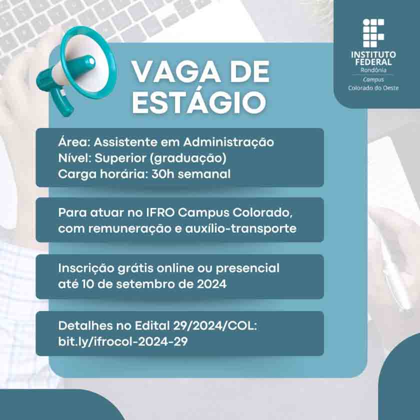 A vaga ofertada é atuação presencial no IFRO Campus Colorado do Oeste na área de Assistente em Administração. Para essa área há uma vaga, de 30 horas semanais, tendo como formação exigida ser acadêmico a partir do 2º período/semestre curso de Administração, Ciências Contábeis ou Gestão Pública, além de outros requisitos específicos listados no Edital 29/2024/COL, que está disponível em: https://bit.ly/ifrocol-2024-29