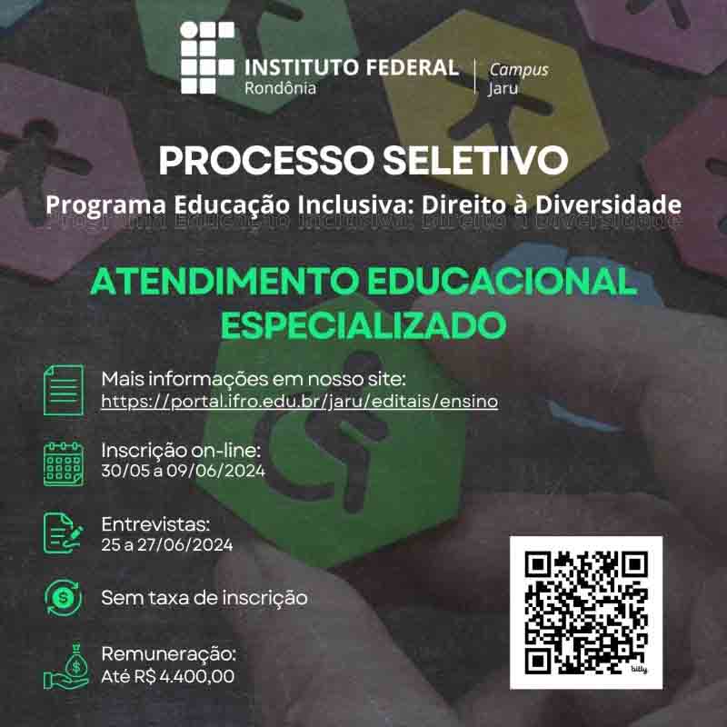 O Campus Jaru do Instituto Federal de Rondônia (IFRO) lançou o Edital nº 19/2024 visando à seleção de Bolsistas na modalidade Colaborador Externo, para atuação no “Programa de Educação Inclusiva: Direito à Diversidade do IFRO”. A seleção de profissionais colaboradores externos destina-se à implementação de Atendimento Educacional Especializado (AEE).