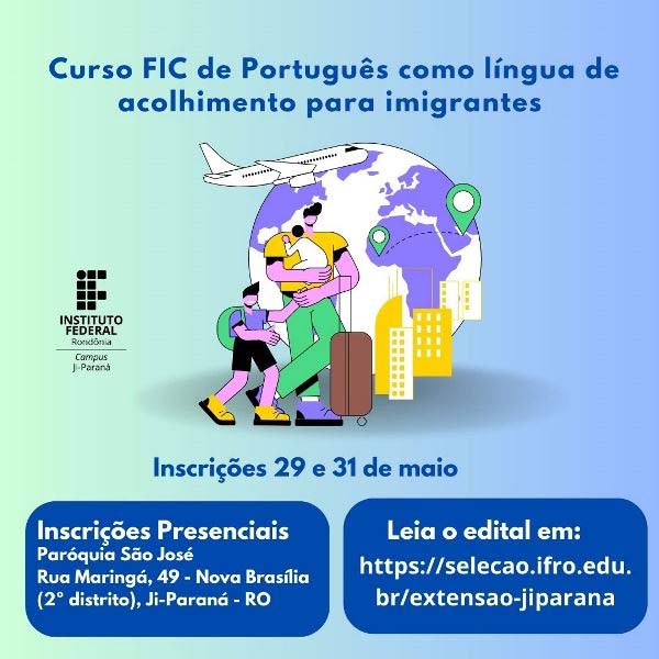 Estão abertas as inscrições para o curso de Conversação em Português como Língua de Acolhimento para Imigrantes no Instituto Federal de Educação, Ciência e Tecnologia de Rondônia (IFRO), Campus Ji-Paraná. As inscrições podem ser realizadas nos dias 29 e 31 de maio, na Paróquia São José, localizada na Avenida Maringá, nº 49, Nova Brasília, no segundo distrito de Ji-Paraná – RO.