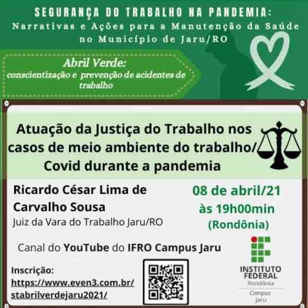 Durante o mês de abril ocorrerão três palestras e uma roda de conversa com profissionais, os quais abordarão temas relacionados à sensibilização, conscientização e prevenção da saúde e segurança no trabalho. A palestra do dia 8 de abril, às 19 horas, será “Atuação da Justiça do Trabalho nos casos de meio ambiente do trabalho/Covid durante a pandemia”, com o Juiz da Vara do Trabalho Jaru/RO, Ricardo César Lima de Carvalho Sousa.