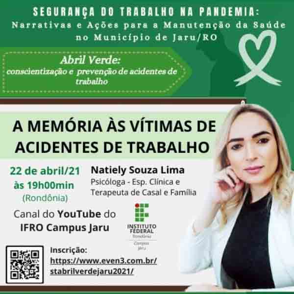 O Instituto Federal de Educação, Ciência e Tecnologia de Rondônia (IFRO), Campus Jaru, está com inscrições abertas para o Abril Verde. No evento serão abordados temas relacionados à Segurança e Saúde no Trabalho. Realizado de 8 a 27 de abril de 2021, em ambiente on-line, o evento este ano tem como tema: “Segurança do Trabalho na Pandemia: Narrativas e Ações para a Manutenção da Saúde no Município de Jaru/RO”.