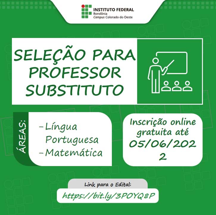 Estão abertas as inscrições no Processo Seletivo Simplificado para a contratação de professores substitutos para o Instituto Federal de Educação, Ciência e Tecnologia de Rondônia (IFRO), Campus Colorado do Oeste. Há uma vaga para cada área, que são Língua Portuguesa e Matemática.