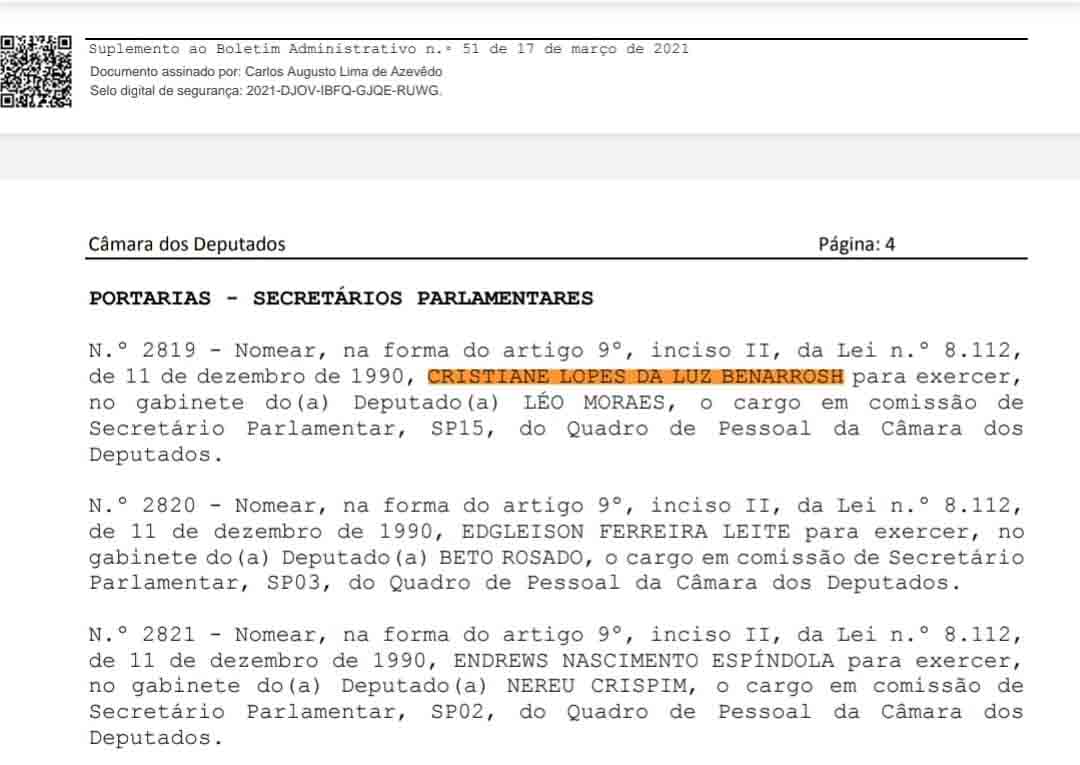 Cristiane foi nomeada para exercer o cargo em comissão de secretária parlamentar no gabinete do deputado Léo Moraes, referência SP15, do quadro de pessoal da Câmara dos Deputados, em Brasília. A nomeação foi publicada no último dia 17 deste mês.