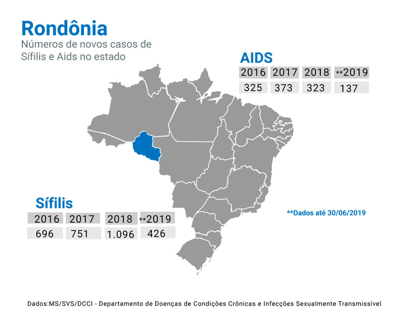 Além da sífilis, o estado de Rondônia registrou quase 140 casos de HIV, apenas nos seis primeiros meses do ano passado. Já a Aids, doença causada pelo HIV, atingiu mais de 5.700 moradores do estado, nos últimos 20 anos. As hepatites virais mataram mais de 640 rondonienses, de 2000 a 2017.