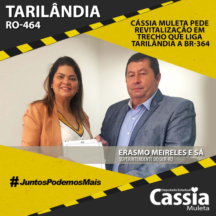 A deputada Cássia Muleta (Podemos) indicou ao Governo do Estado para que, através do Departamento de Estradas e Rodagens (DER), sejam feitos reparos e recapeamento asfáltico na RO-464, que liga o distrito de Tarilândia a BR-364.
