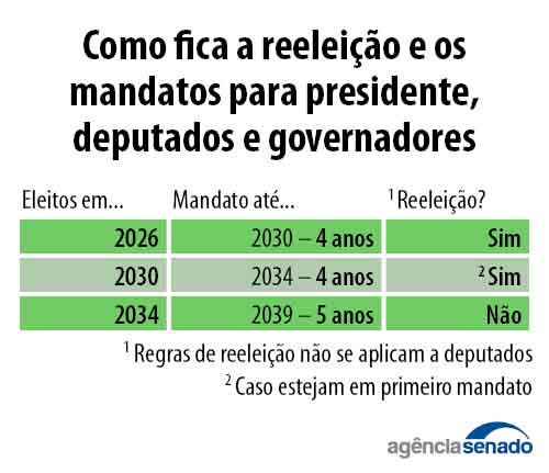 Outra inovação é o fim da eleição alternada para o Senado. Atualmente, os senadores são eleitos a cada quatro anos, com dois terços do Senado se renovando em uma eleição e um terço na seguinte. Na nova fórmula, todas as 81 cadeiras do Senado estarão em disputa a cada cinco anos.