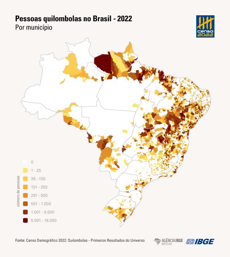 Em todo o Brasil, foram contados 1.327.802 quilombolas, sendo Bahia (397.059 pessoas), Maranhão (269.074), Minas Gerais (135.310), Pará (135.033) e Pernambuco (78.827) os estados com os maiores quantitativos absolutos. Estas cinco Unidades Federativas correspondem a 76,5% do total brasileiro. Entre os menores quantitativos estão Distrito Federal (305 quilombolas), Mato Grosso do Sul (2.546), Amazonas (2.705), Rondônia e Santa Catarina (4.447).