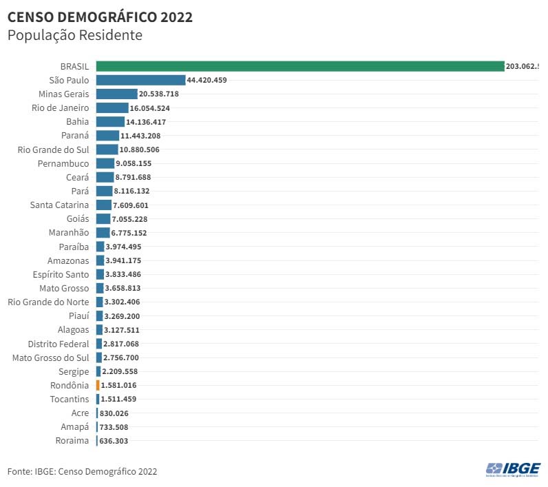 Os primeiros resultados do Censo Demográfico 2022, divulgados na última quarta-feira (28), mostram que Rondônia tem 1.581.016 habitantes, 18.607 pessoas a mais que o apontado no Censo Demográfico 2010, representando um aumento de 1,2% entre as duas operações censitárias. Em todo o Brasil, foram contadas 203.062.512 pessoas.